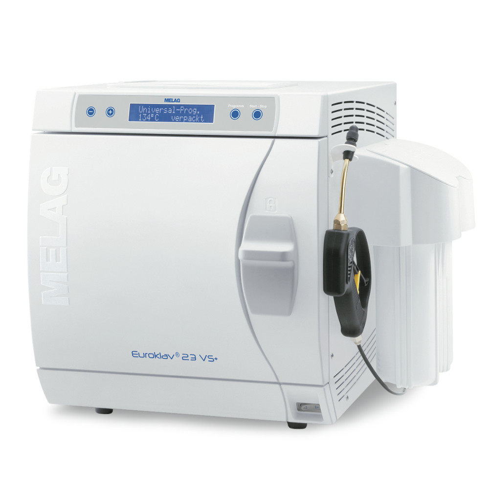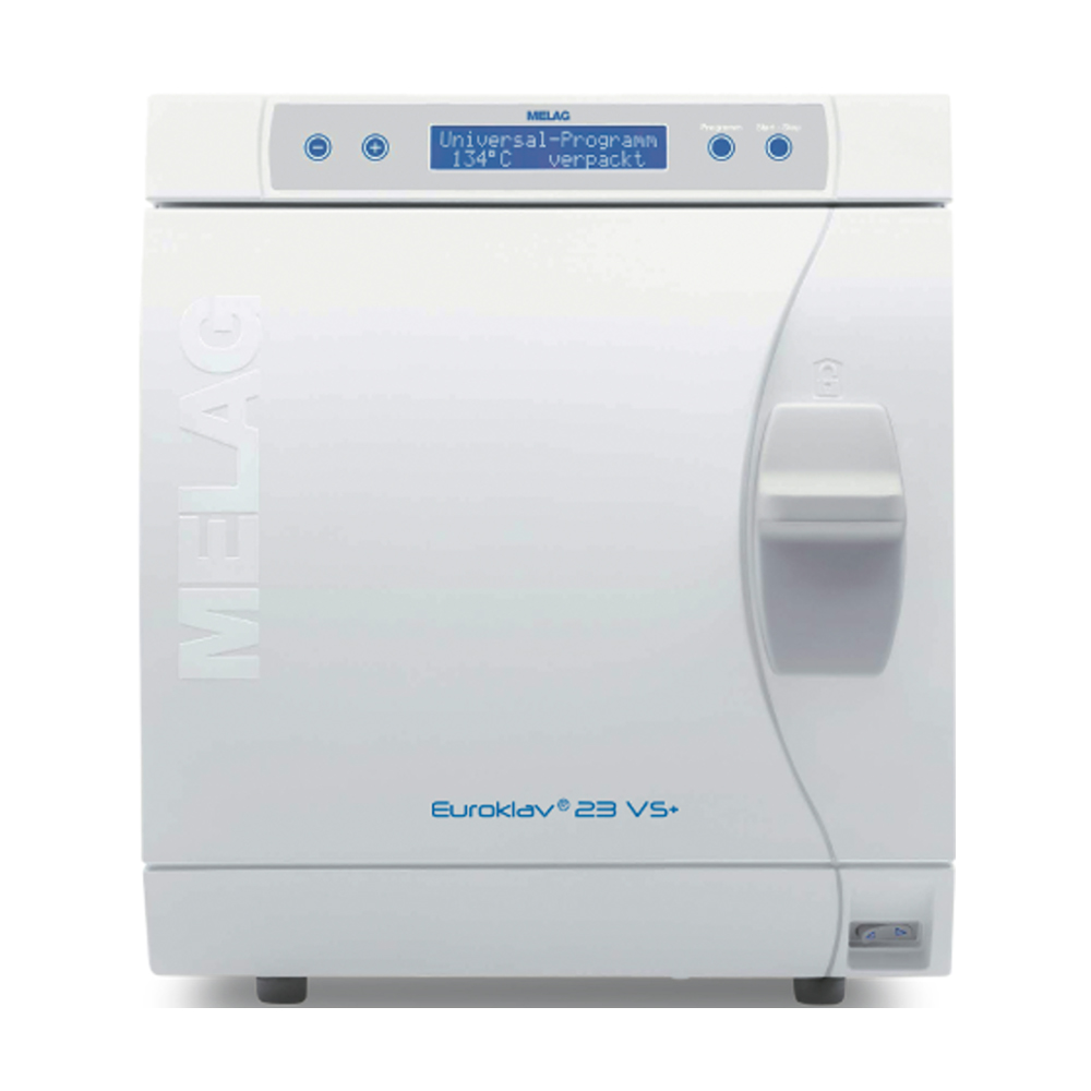 Euroklav 23 VS+ - предложение эконом-класс от компании MELAG. Он актуален там, где тип инструмента или упаковки не требует применения автоклавов «Класса В». Благодаря увеличенному объему камеры (22 литра, глубина камеры 45 см), Euroklav 23 VS+ пригоден для кабинетов, где требуется стерилизация более длинных инструментов, упаковок или кассет.
