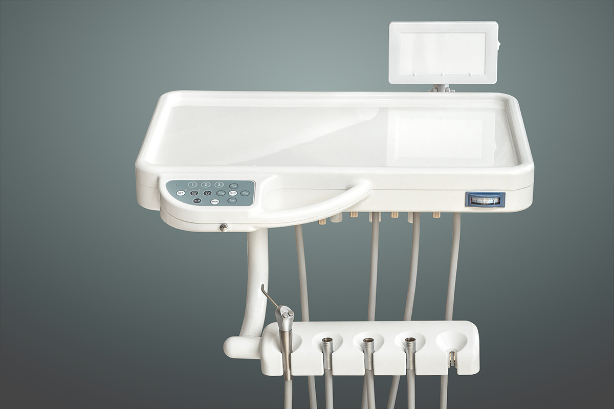 Эргономичный блок врача имеет панель управления креслом и гидроблоком, манометр давления, регулировку подачи воды и воздуха на каждый инструмент.