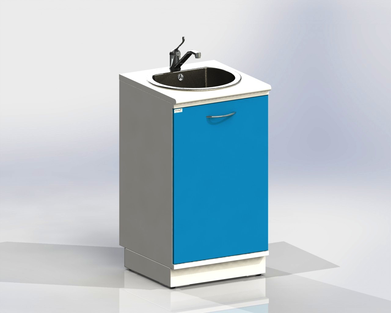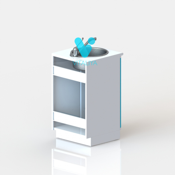 Тумба с дверцей, с вырезом в задней стенке для подвода коммуникаций, оснащена мойкой из нержавеющей стали, локтевым смесителем, сифоном.