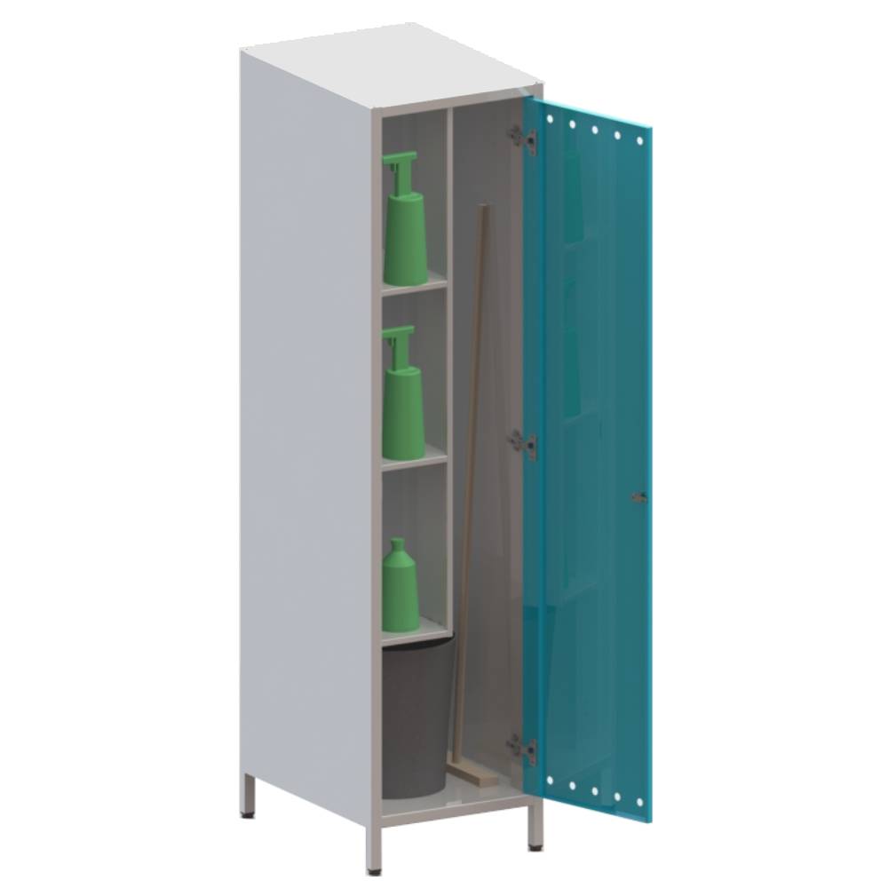 Шкаф одностворчатый на ножках, выполненных цельно с корпусом шкафа. Оснащается дверкой. Предназначен для размещения уборочного инвентаря. Внутри шкафа три полки для размещения инвентаря, держатели для швабр, отделение для ведра.
